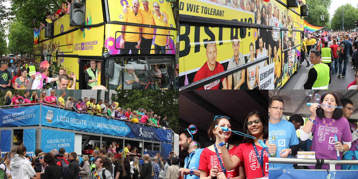 Und schließlich gibt es noch die großen Wagen und organisierten Gruppen, die komplette Sattelschlepper-Designkonzepte – vom Wagenbanner, bis zum T-Shirt, der Parteifahne, Luftballons, Sonnenbrille, sogar der Sektflasche mit Werbe/Parteilogo umsetzen. Diese großen Wagen sind für die Mehrheit der Teilnehmenden und Zuschauer_innen eine der Hauptattraktionen und die am stärksten wahrgenommene Teilnehmerart. Fragen an Zuschauer am Rand zeigen allerdings gleichermaßen, dass eine beträchtliche Anzahl an Teilnehmenden und Zuschauer_innen aus der Community gerade diese Sattelschlepper kritisch sehen. Dabei werden sowohl Parteiensattelschlepper als auch Firmentrucks als „kommerziell“ – weil durchdesigned, teuer und werbeträchtig – wahrgenommen. Die betroffenen Gruppen selbst hingegen äußern sich eher kritisch über den jeweils anderen, während die eigene Teilnahme als politischer, inhaltsstärker und wichtiger gesehen wird. Anders gesagt: die Parteien rümpfen die Nase über die queeren Unternehmensgruppen, wegen der Firmenwerbung, der unpolitischen Musik und Partystimmung, dem Gratis-Sekt, der Kommerzialisierung und der Vereinnahmung durch die Wirtschaft. Umgekehrt werden Parteitrucks kritisch gesehen, wegen der Wahl- und Parteiwerbung, der unpolitischen Musik und Partystimmung, dem Gratis-Sekt, den Parteilogos und der Vereinnahmung des CSD durch die Parteipolitik. Beide Sichtweisen sind legitim, genauso wie die Teilnahme beider Gruppen legitim und wichtig ist. Dabei machen sich gerade die queeren Unternehmensgruppen sehr intensiv Gedanken, wie sie auftreten und welche Botschaften und Inhalte auf ihren Wagen, T-Shirts, Bannern etc. verbreitet werden und dabei spielen aktuell die Werbebotschaften (auf den nachfolgenden Bildern die Trucks der BVG und der dbPride/Deutsche Bank) eine eher untergeordnete Rolle.
